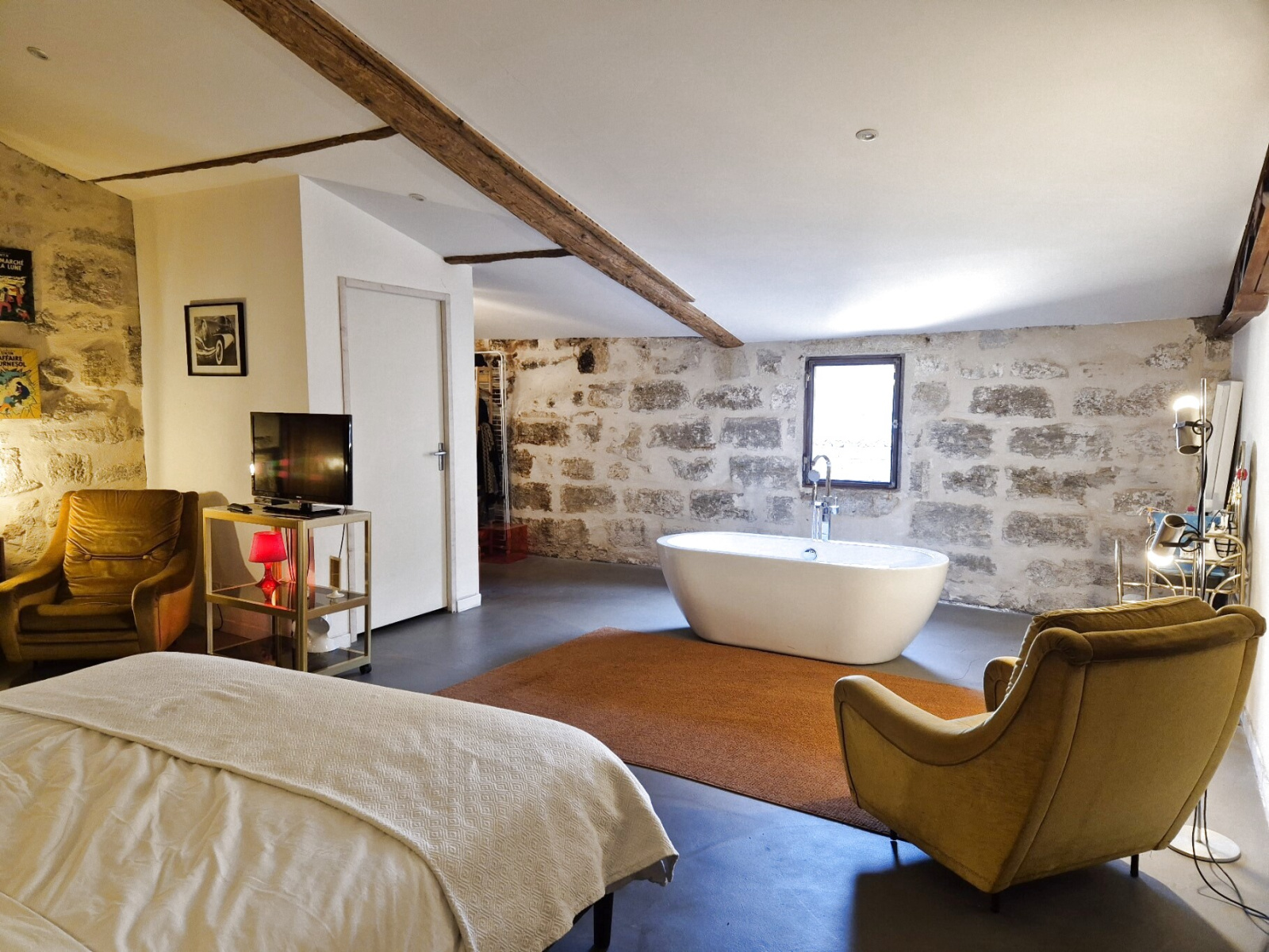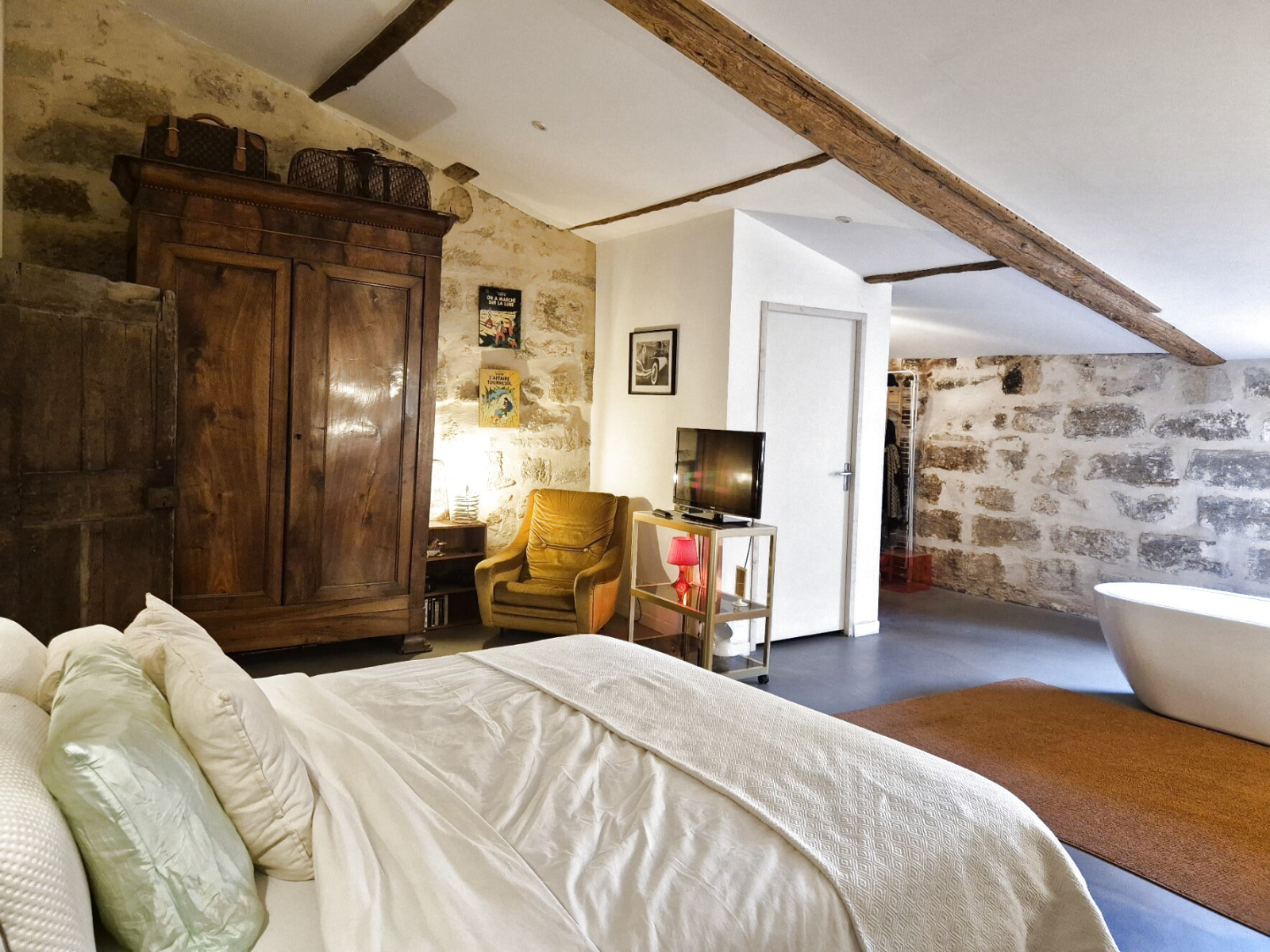 Une belle suite parentale avec vue sur le clocher, un grand bureau avec salle d'eau et wc indépendant aisément convertible en deuxième suite, une terrasse en partie couverte abritant une cuisine d'été et un charmant patio offrant une vue panoramique sur les toits complètent cet atypique et magnifique cadre de vie!