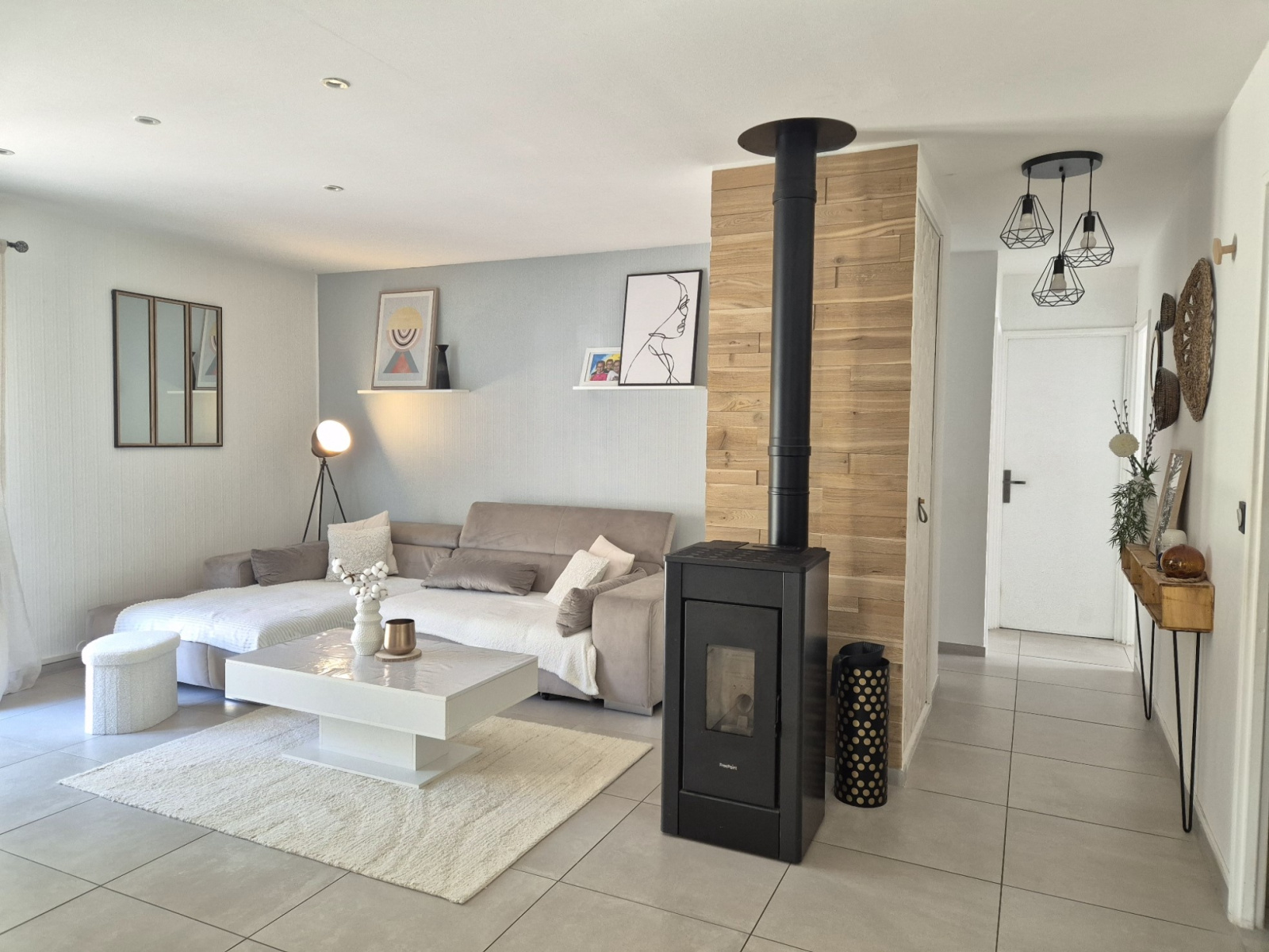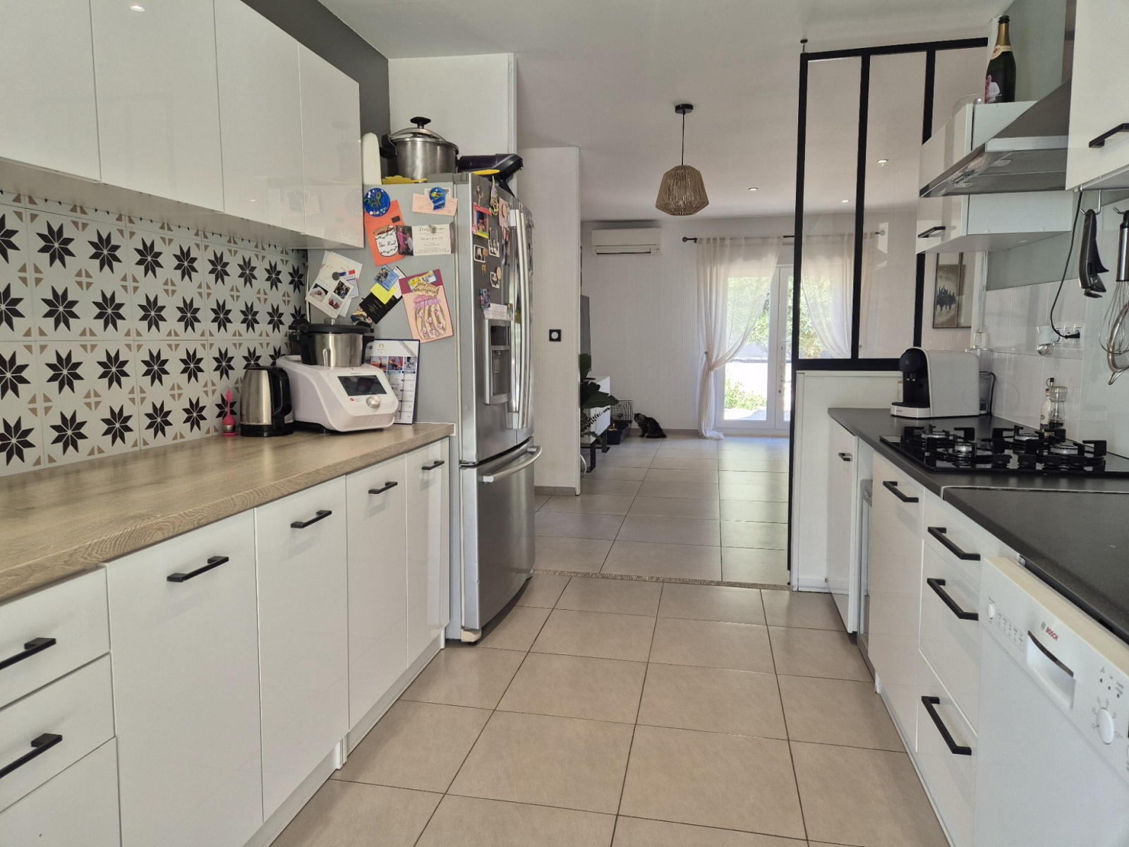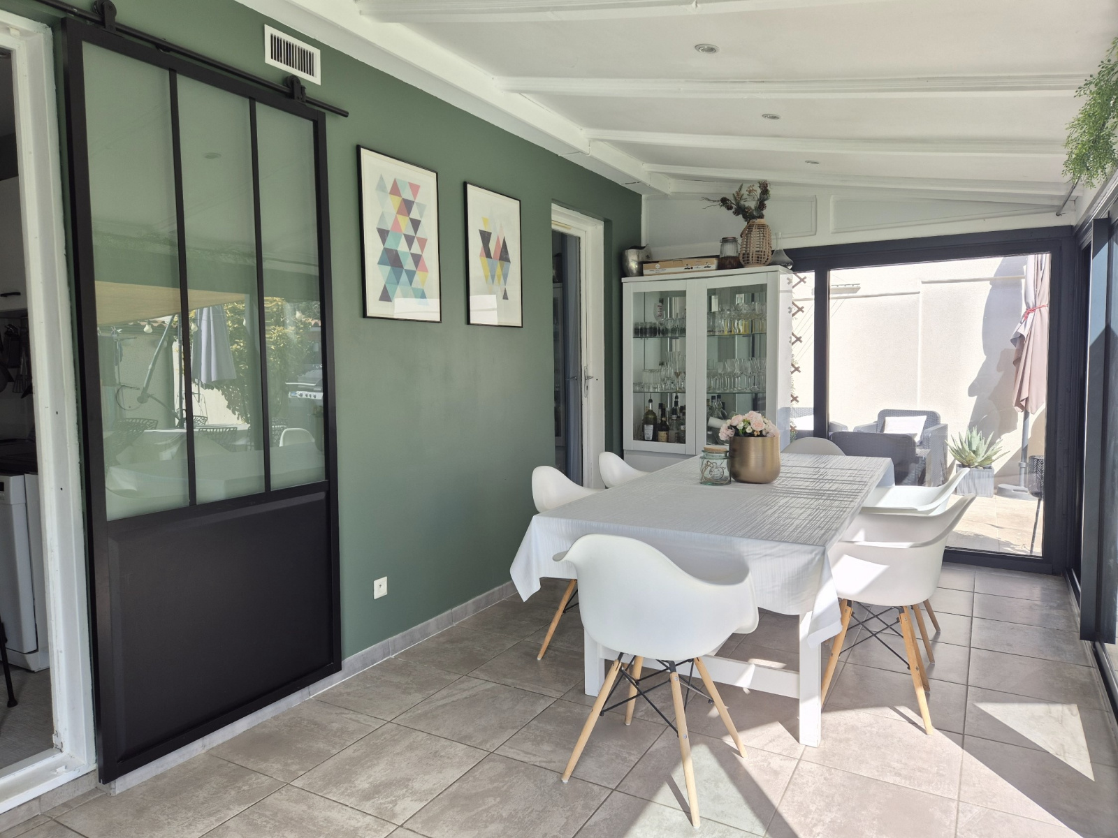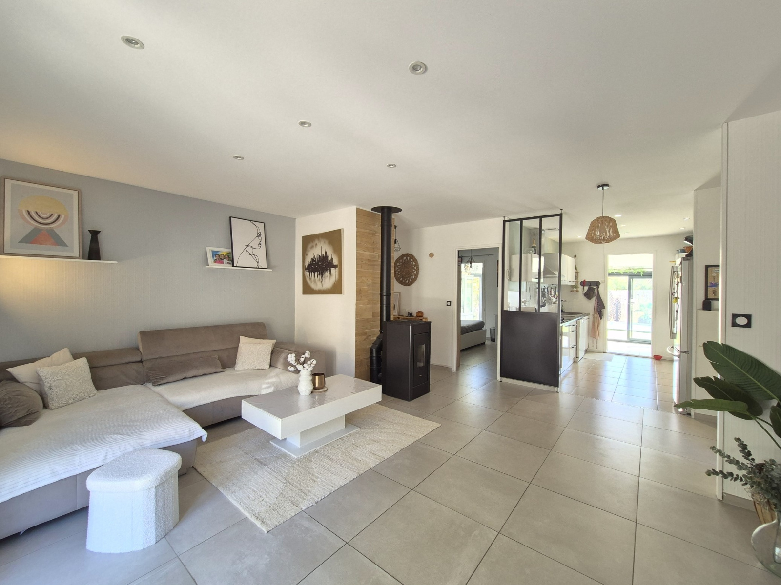 Confortable et lumineuse, elle offre une spacieuse pièce de vie agrémentée d'un poêle à granules, une cuisine moderne et équipée ouverte sur le salon d'un côté, et sur une belle véranda-salle à manger de l'autre. L'espace nuit accueille 3 chambres avec rangements, une salle d'eau moderne et fonctionnelle, et un wc indépendant.
