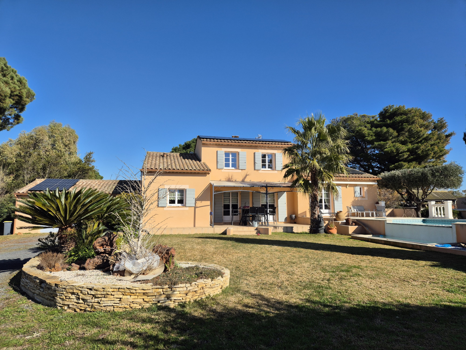 Cette belle bâtisse, de type Languedocien, offre tout le confort d'une maison moderne de par sa climatisation réversible et ses panneaux solaires tout en conservant charme et authenticité.