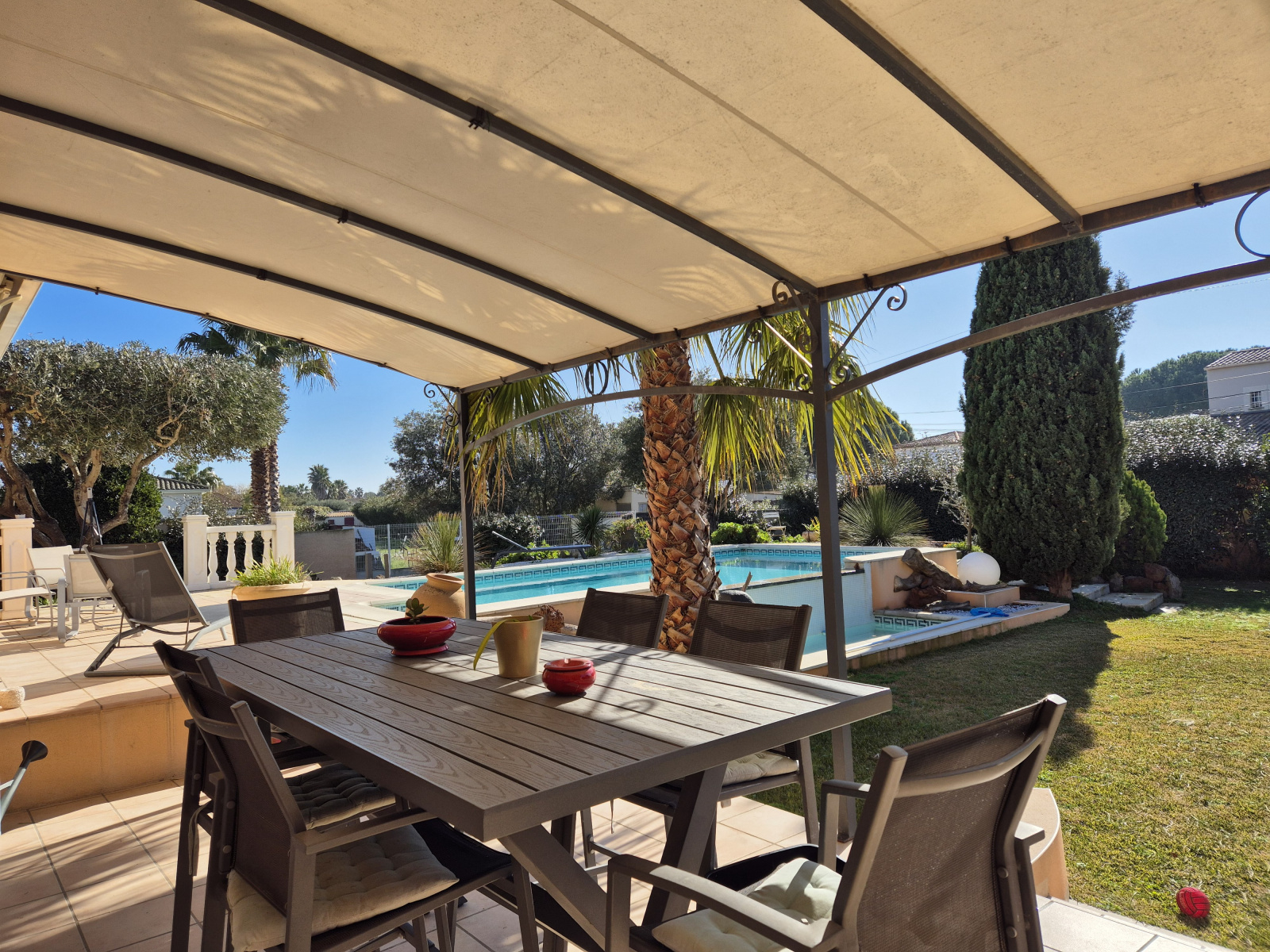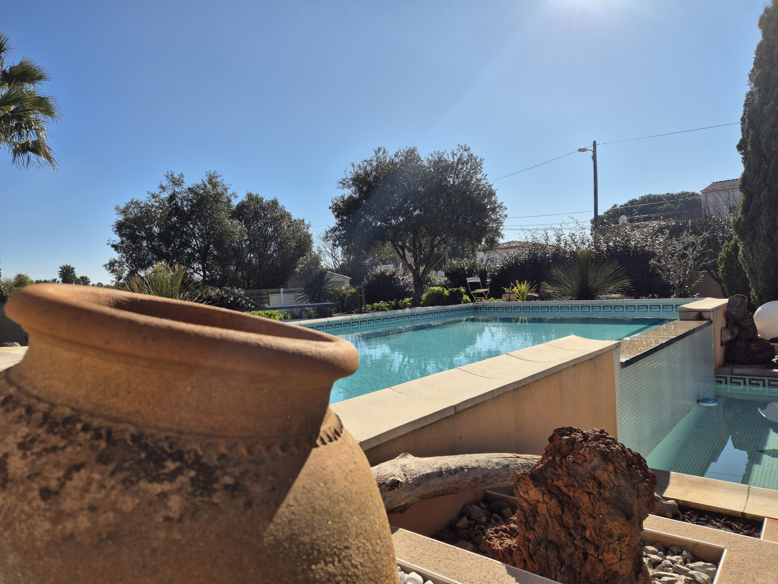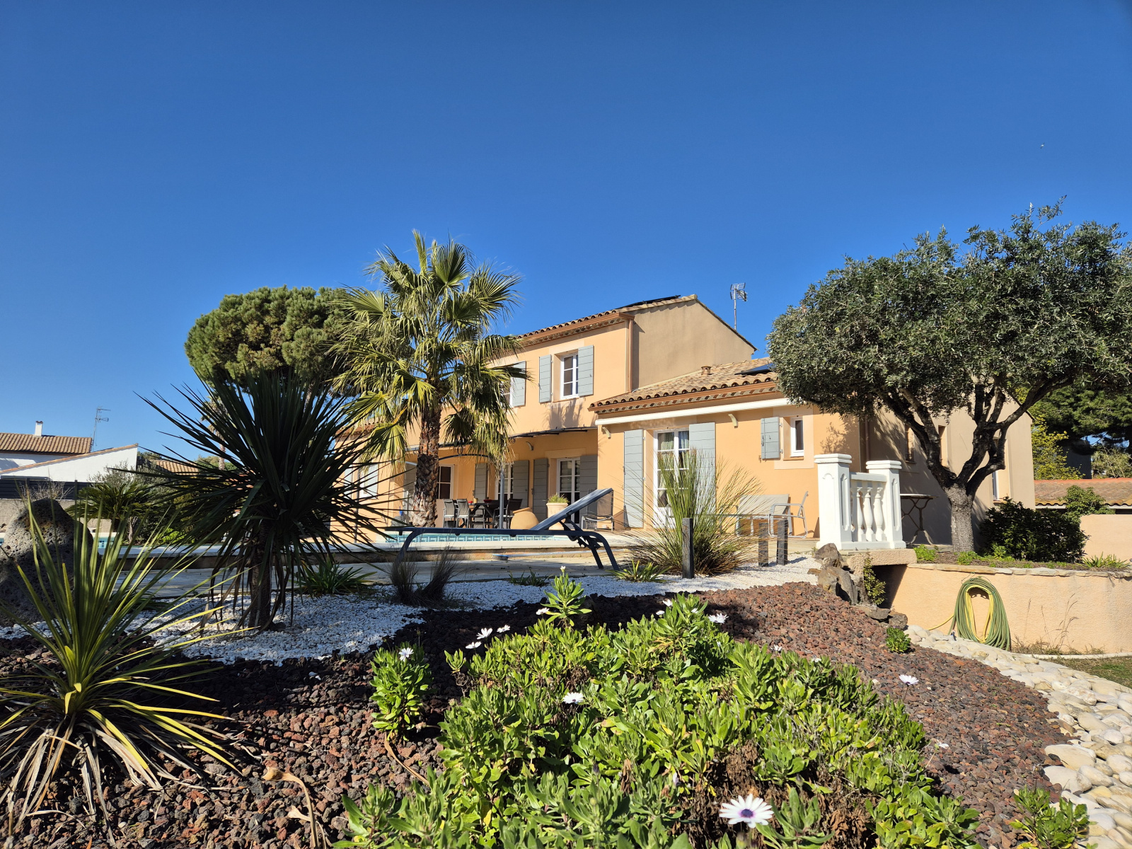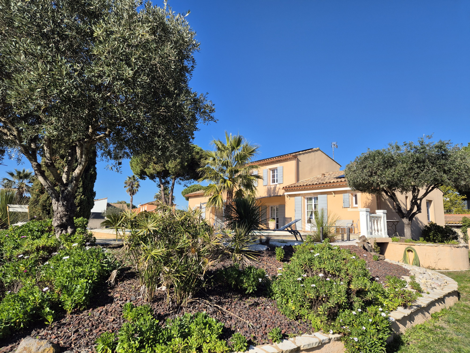 Une fois passé le grand portail automatique, on ne peut que tomber en admiration devant ce beau jardin méditerrannéen surplombé par une magnifique piscine à débordement!