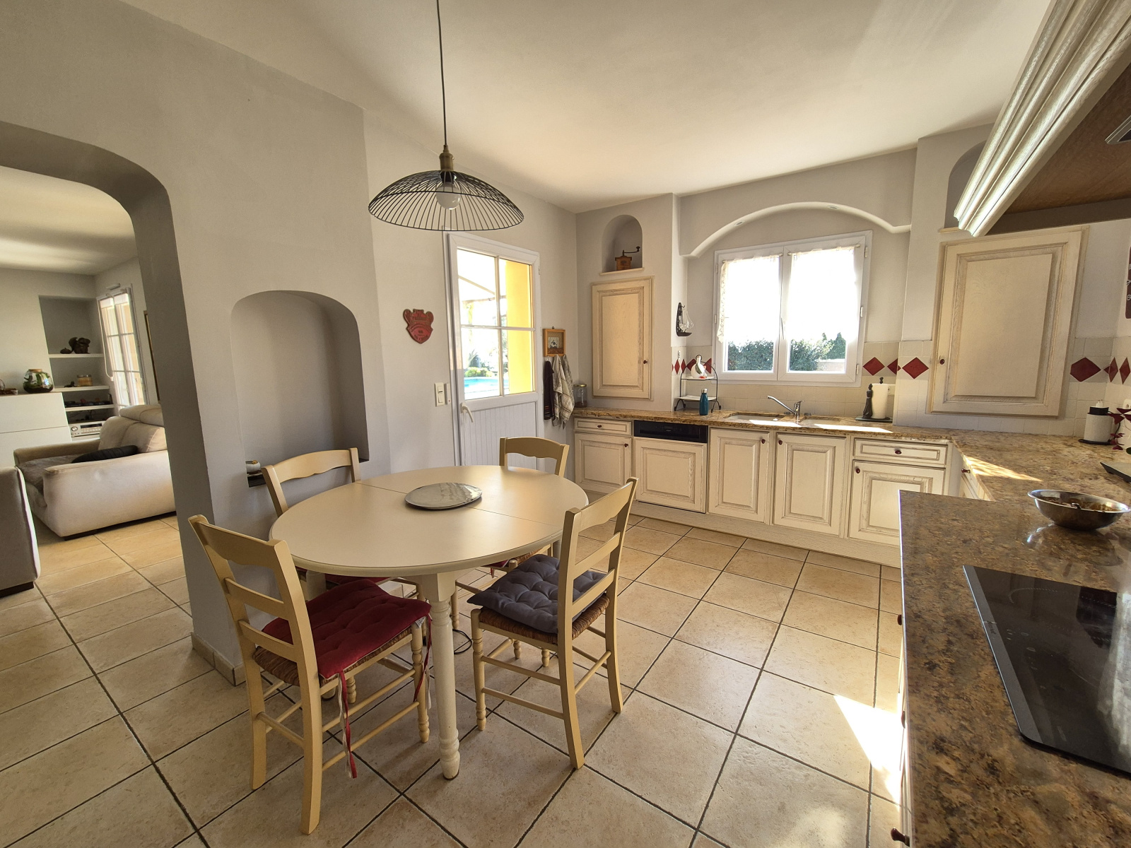 Elle se compose d'une entrée, d'un cellier pratique, d'une cuisine spacieuse et fonctionnelle, d'une salle à manger, d'un salon lumineux équipé d'une cheminée à insert ouvert sur une belle terrasse couverte, les trois formant un espace de vie de plus de 60m². Une paire de marches mène à l'espace nuit qui abrite quant à lui, une salle d'eau, un wc indépendant, 2 chambres spacieuses et une superbe suite parentale avec salle d'eau et dressing en suite le tout donnant directement sur la piscine et la terrasse ensoleillée.