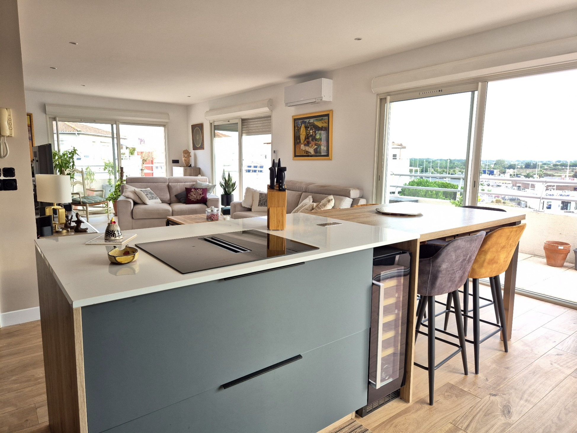 Les portes de l'ascenseur s'ouvrent directement sur le hall d'entrée qui dessert une très belle cuisine à la fois fonctionnelle et moderne, ouverte sur un beau et grand séjour lumineux et une fantastique terrasse de presque 100m² à la vue bien dégagée.